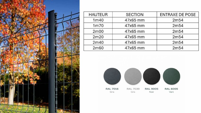 Les poteaux à encoche sont une solution fiable et performante pour l’installation de clôtures rigides. Grâce à leur conception solide et à l’intégration directe des panneaux dans les encoches, ils assurent un excellent maintien de l’ensemble.