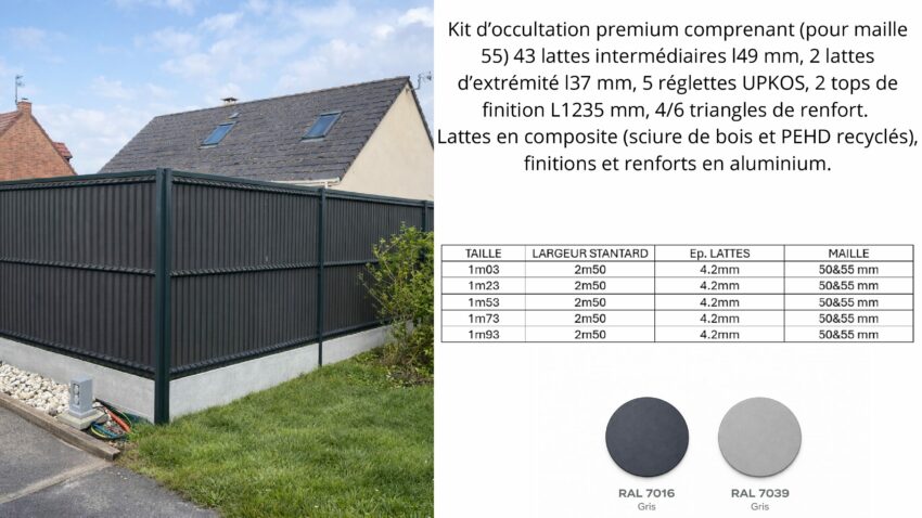 Kit d’occultation premium comprenant (pour maille 55) 43 lattes intermédiaires l49 mm, 2 lattes d’extrémité l37 mm, 5 réglettes UPKOS, 2 tops de finition L1235 mm, 4/6 triangles de renfort. Lattes en composite (sciure de bois et PEHD recyclés), finitions et renforts en aluminium.