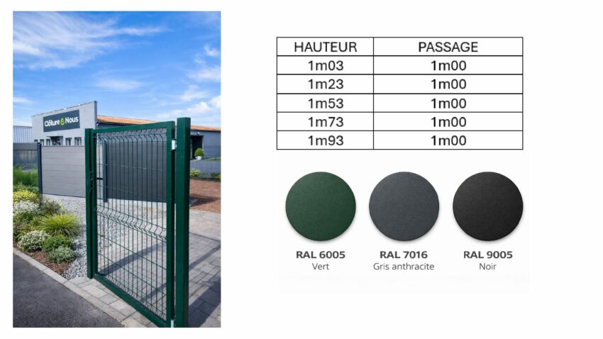 Conçus en acier galvanisé et thermolaqué, les portillons offrent une excellente résistance aux intempéries, à la corrosion et à l’usure du temps. Disponibles en différents formats et coloris, ils s’adaptent parfaitement aux clôtures rigides, occultantes ou décoratives.