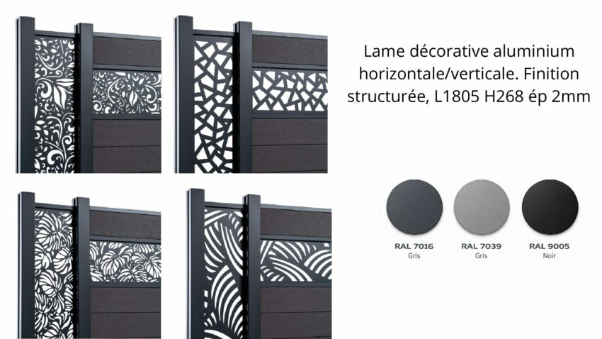Les lames décoratives en aluminium sont la solution idéale pour moderniser et personnaliser votre clôture. Disponibles en pose verticale ou horizontale, elles apportent à la fois esthétisme, intimité et durabilité à vos aménagements extérieurs.